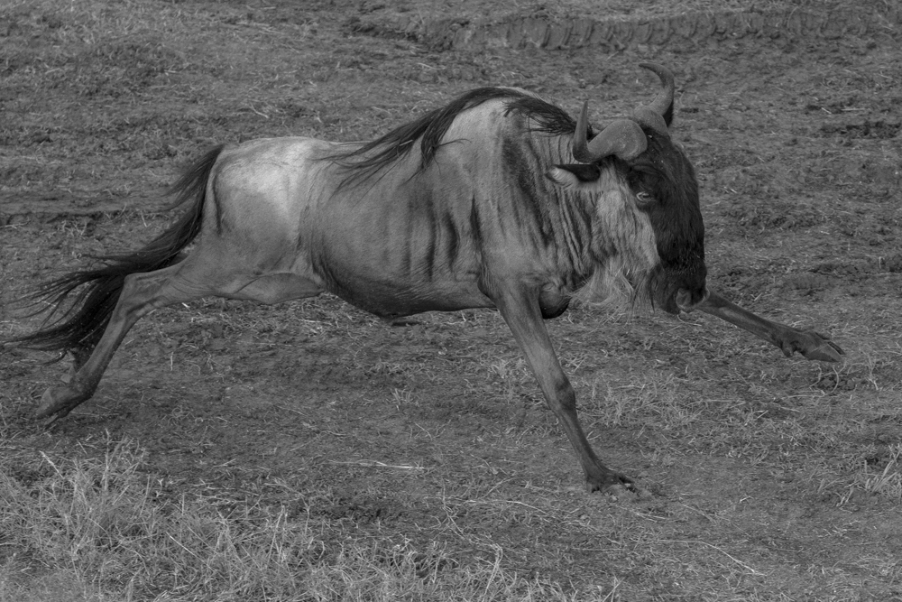 I was also happy to get this capture of a wildebeest. It is a little mundane but shows off the beautiful striping on their necks. They are gorgeous, agile creatures even if not particularly bright around predators (Daniel joked that they are called “spare parts” by the guides).