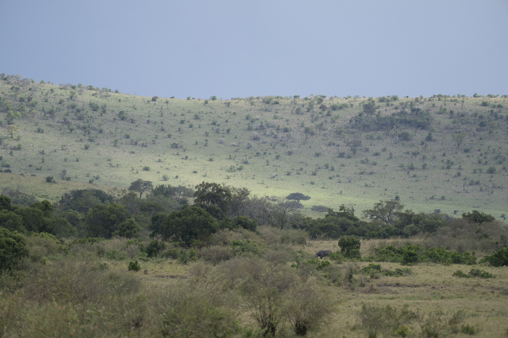 Daniel spotted a Rhino in the distance – very rare on the Mara. He grabbed this shot, which I like more because of how it shows the green rolling hills of the Mara.