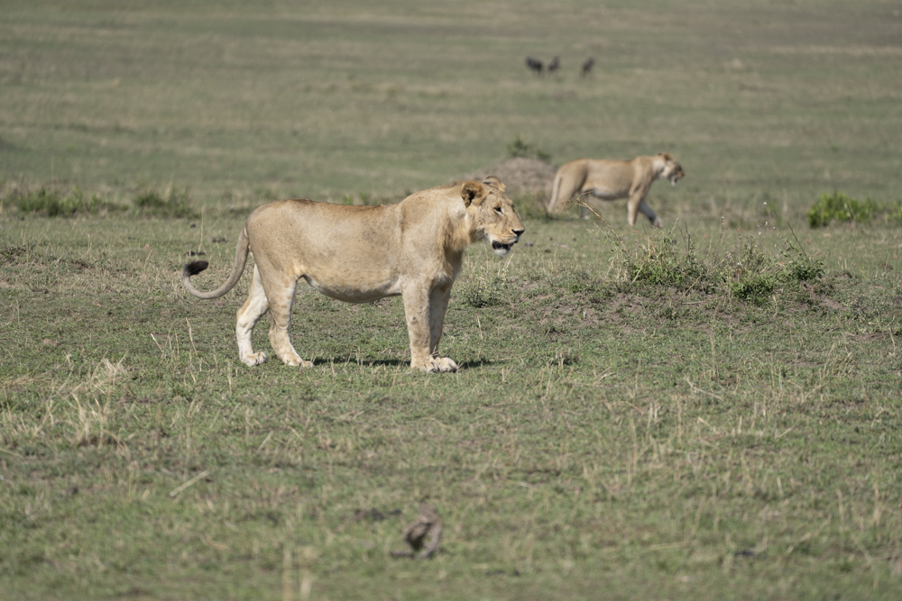 The female seemed like she wanted to hunt, but the male was much more interested in courting. Even though the wildebeest wandered right up to them, his shenanigans (standing up, vocalizing, etc) eventually gave their position away. She was not pleased.