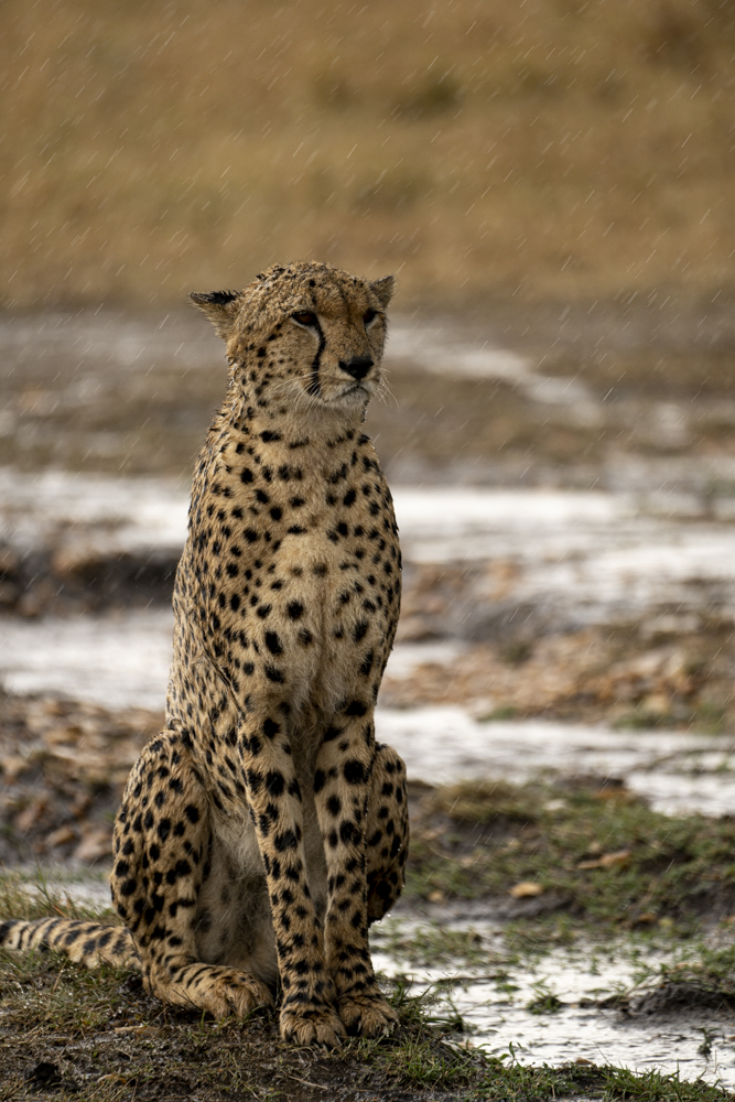 Big cats in the rain look just like cats in the rain, only bigger.