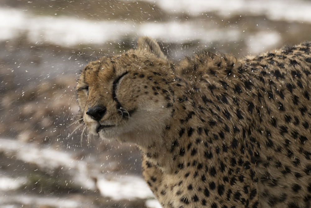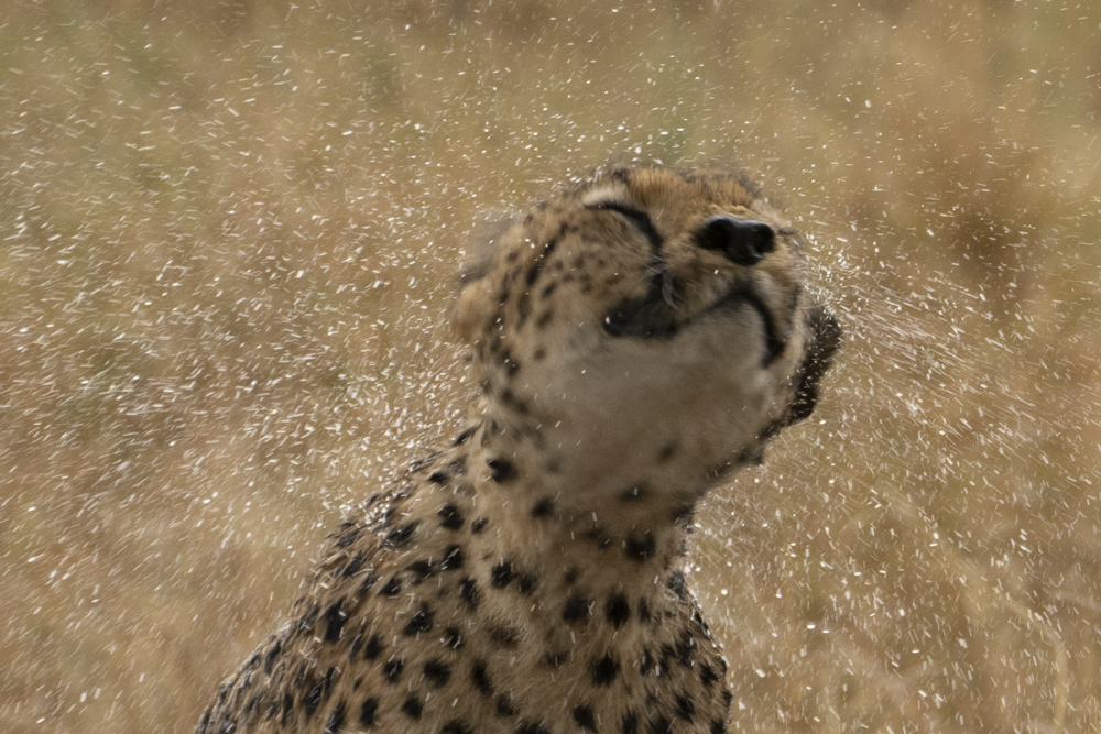 Exactly the face I make when my dogs shake off on me.I swear he’s smiling.Lets do one together!I bet wet cheetah smells even better than wet wildebeest.