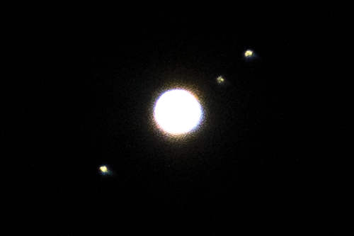 Jupiter’s moons.Jupiter’s clouds.Saturn’s ringsA very small stack of about 1m exposure at ISO 4000, 12mm, F2.8. I am just learning to do stacking, and the rotation of the sky combined with lens distortion led to unsatisfying results. I need to learn to do better . . . For comparison, this is a single exposure of 30s, 4000 ISO, F2.8 at 12mm.