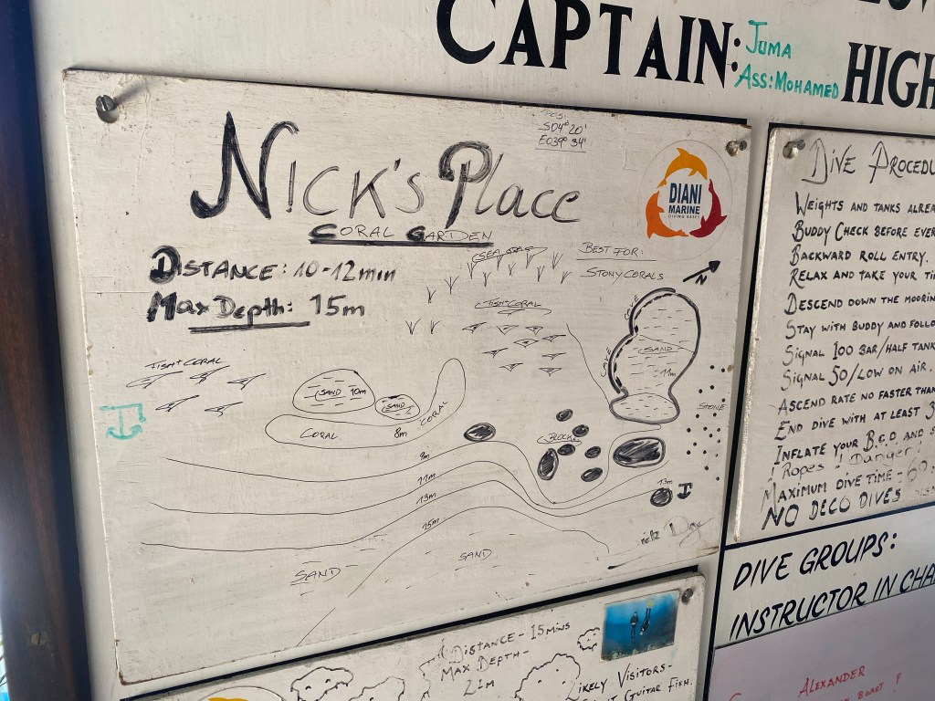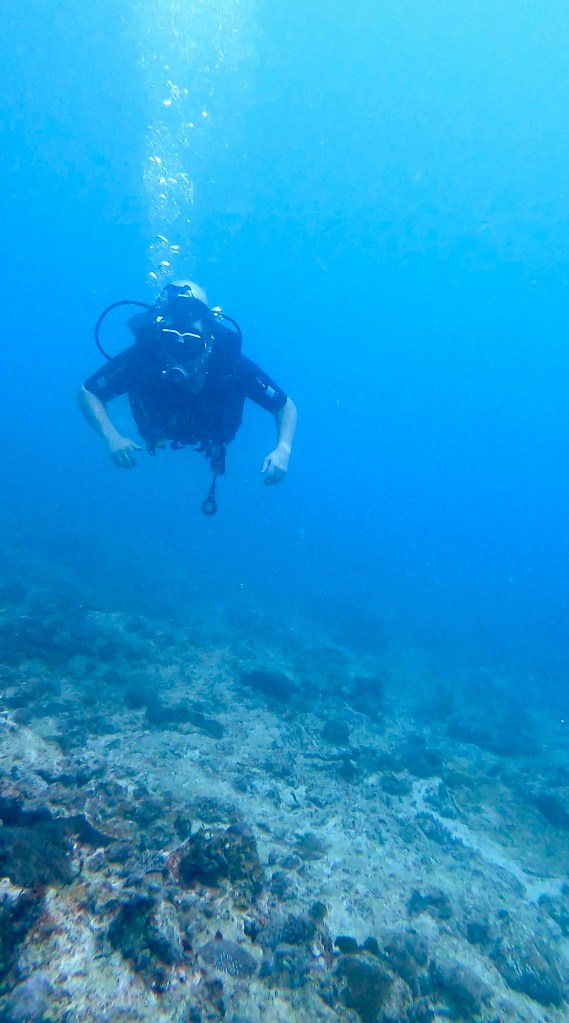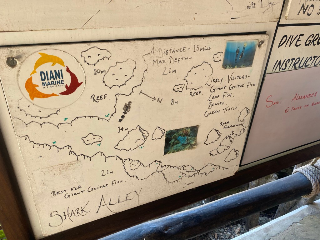 We did our shore brief, planning on two sites – Nick’s Place, and Shark Alley. Nick’s Place was named for an advanced diving student who discovered the site, and Shark Alley because once a white-tipped shark had been spotted there . . . once. But Shark Alley sounds cool 😊