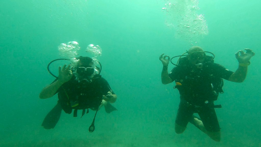 Back on the boat, I got out of my wetsuit and had some fruit to clear the salt, and we motored back to a fishing pier to disembark – the water was just too skinny for us to get back to the dive center.