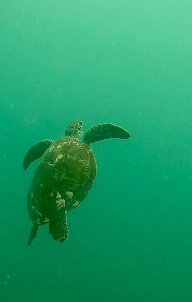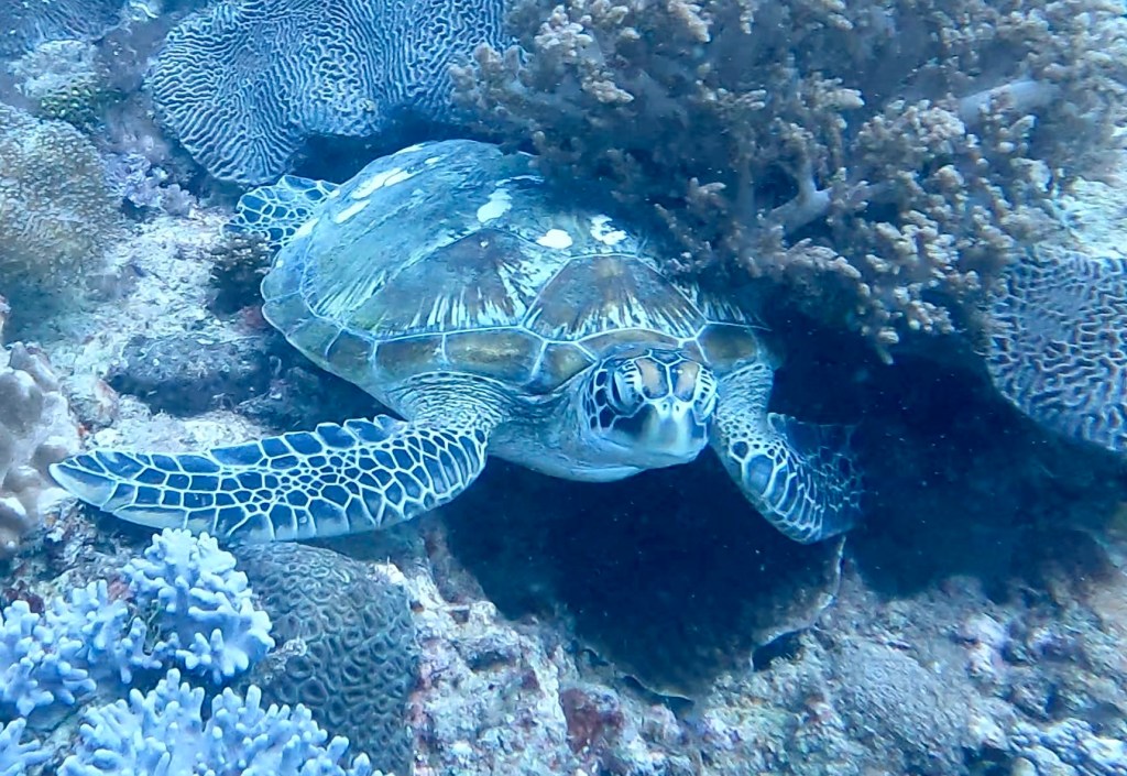 Saidi retied the mooring line, which was pretty cool to watch, and then we started a loop around shark alley. We didn’t see any sharks, but we did see a bunch more sea turtle and other reef fish. One of the highlights of shark alley for me was the really tall coral formations with mini caves under that acted as nurseries for baby fish.