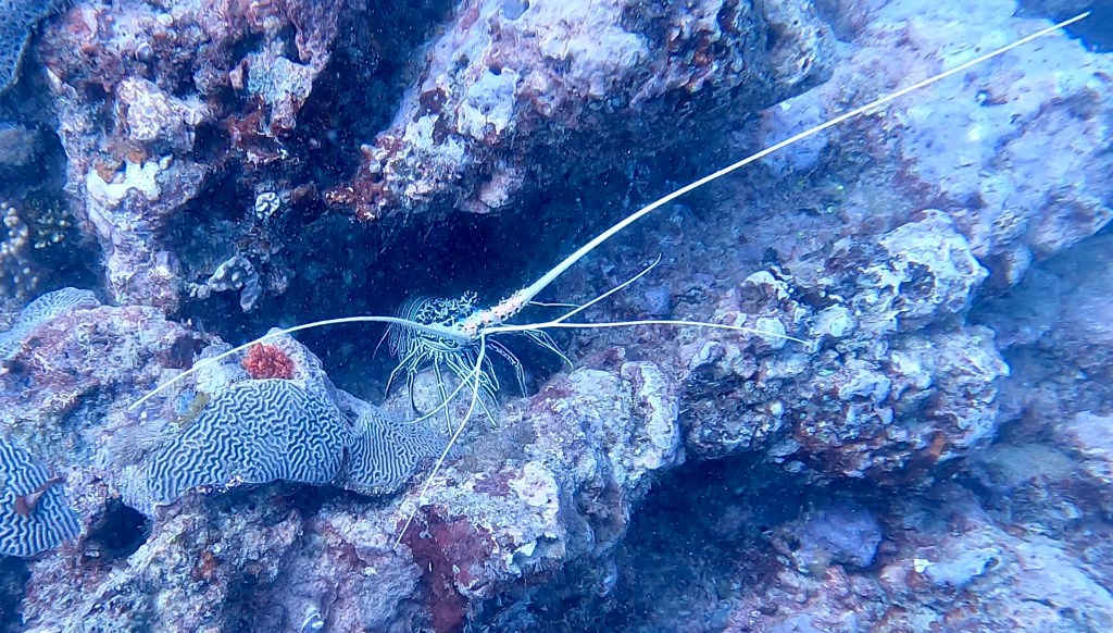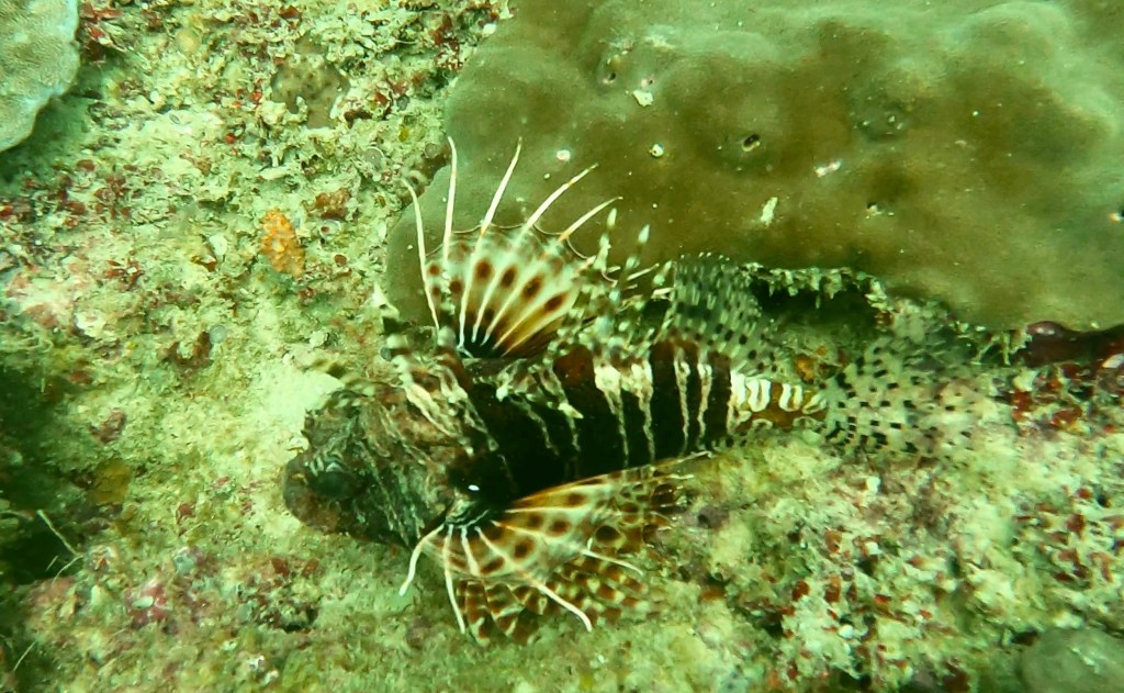 Nick’s place was a first for me, because it was a one-way dive. Basically, we got off the boat and went down to the mooring, then swam at about 18m for about 40m up to the mooring for Shark Alley. I saw blue spotted rays, tons of amazing coral (both soft and hard) and reef fish, as well as her , some more lion fish, angel fish, clown fish (in sea ananome), more lobster, and . . . more. It was a fun dive with the current.