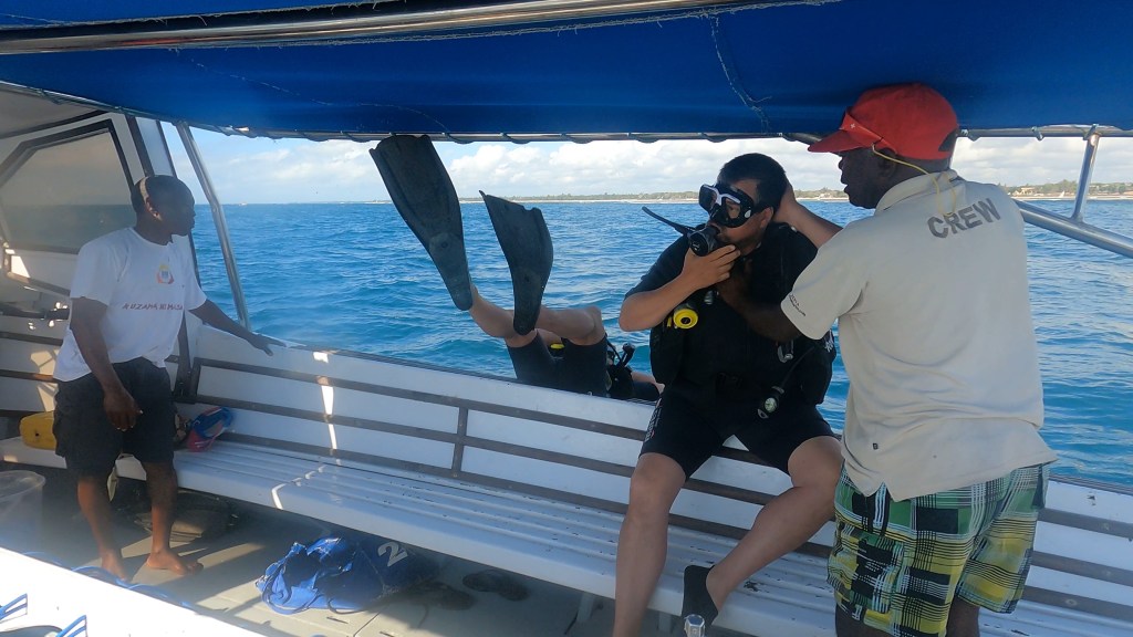 With all the paperwork for diving out of the way, we did a later pickup after breakfast at Alfajiri, getting to the dive center at 0800. By 0815 we were on the boat. Jon was not joining, so I basically had a private dive boat to myself with our two captains and Saidi as my dive master.