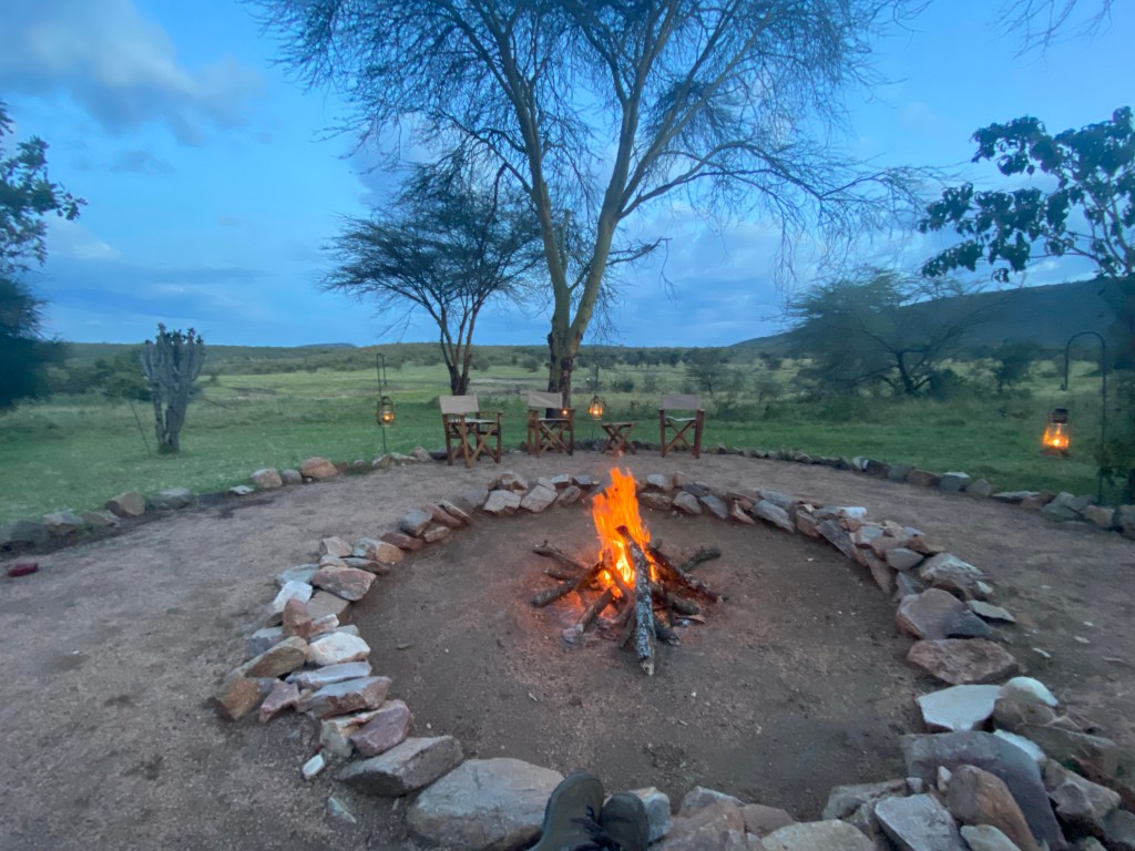 We had asked the chef to do a sampling of traditional dishes for dinner, and the kitchen blew us away, first with Amarro Martini’s by the fire while we talked to several of the Maasai staff, then with an assortment of vegetables and dips with flatbread, all amazingly spiced. Can’t name any of it but all of it was delicious.