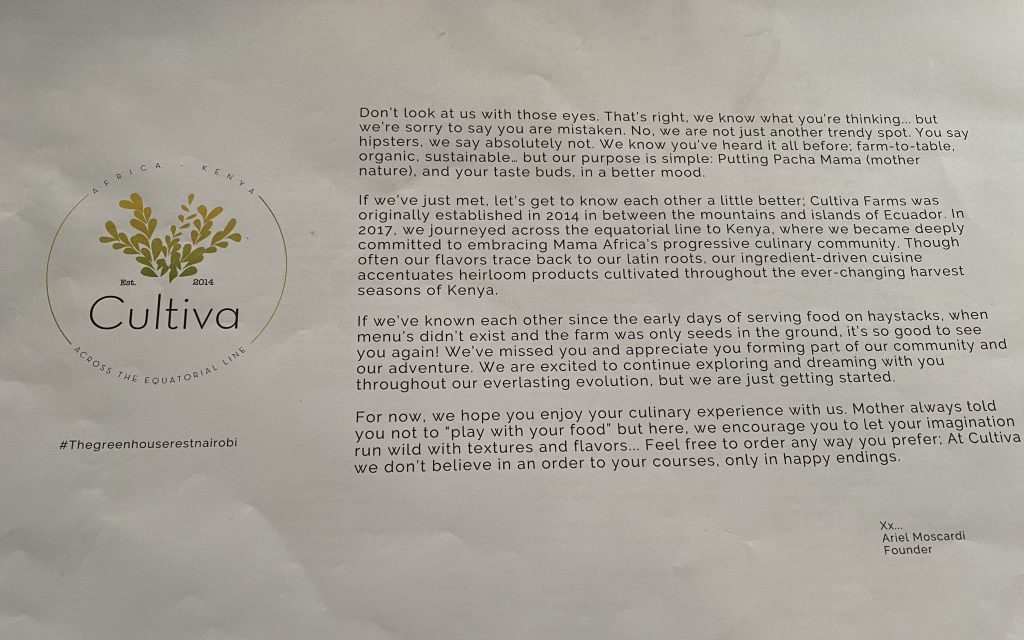 When we left Alfajiri, that was Sofia’s parting gift – “and while you are in Nairobi, you should go to Cultiva – it is amazing, farm to table, and why not?” We had, by this time, learned that we weren’t likely to have better ideas than Sofia’s, so we went as instructed.
