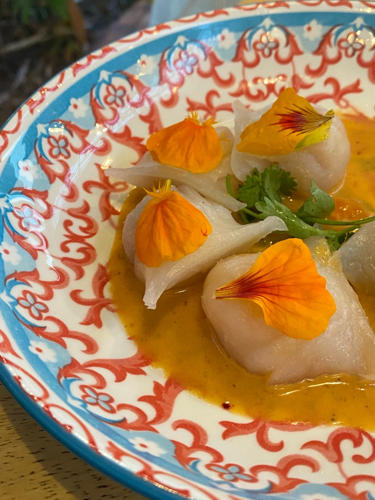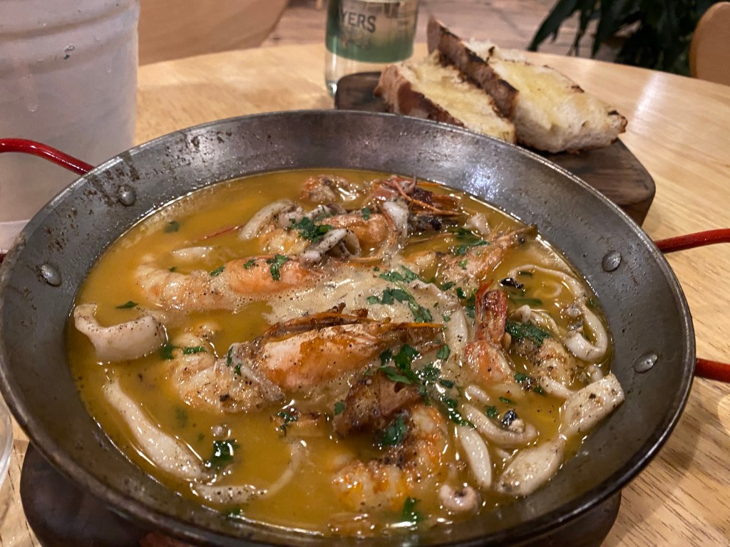 We were led to our table and after delighting in the menu, ordered some amazing cocktails (I had an orange mule made with woodford reserve bourbon – it was incredible). We also had some veggie dips and prawn dumplings for appetizers, and ceviche and some incredible prawn and calamari in broth (replete with house made sourdough baguetter basted in olive oil and heated on a fire grill . . . OMG). All with awesome wine. What a meal. We were too vanquished to attempt desert.