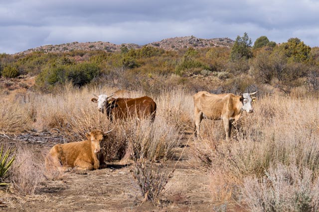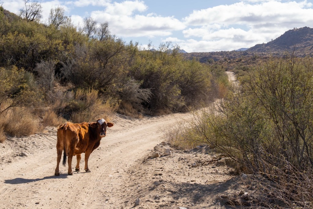 Dylan era el conductor mientras fuimos para el Sky Ranch, siguiendo las senales (rocas pintadas) y la ruta aumentó su dificultidad. Despues un rato en que discutimos un poco, econtramos una vaca. Ella no queria salir del calle, y ella seguimos un rato antes de ella salia la ruta.