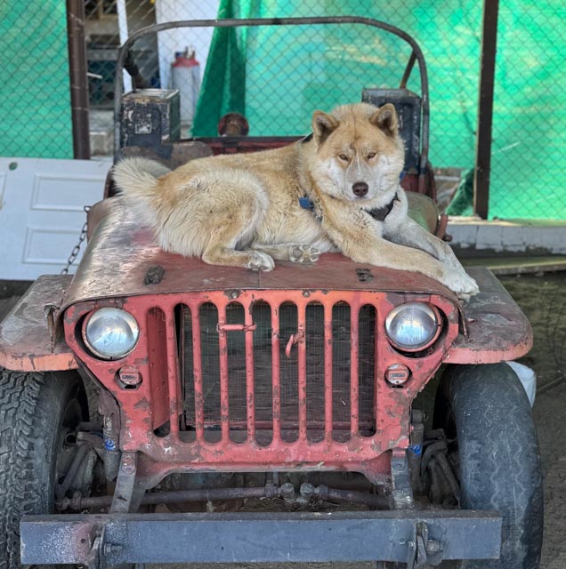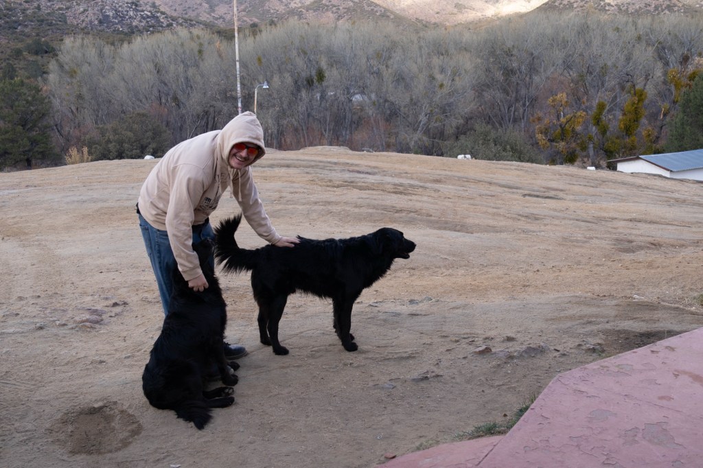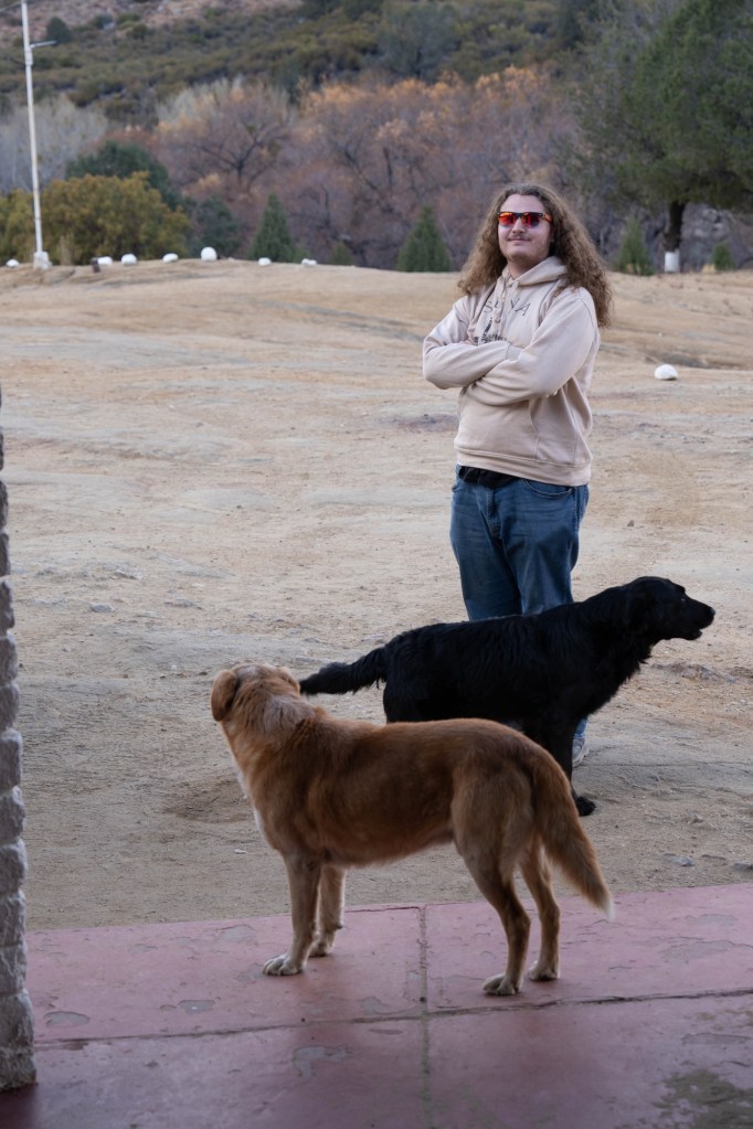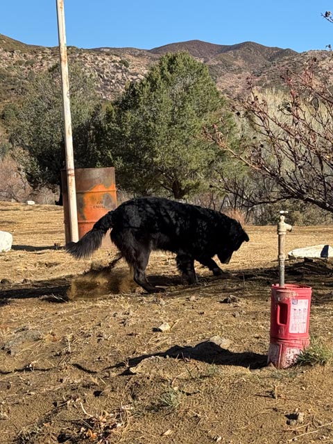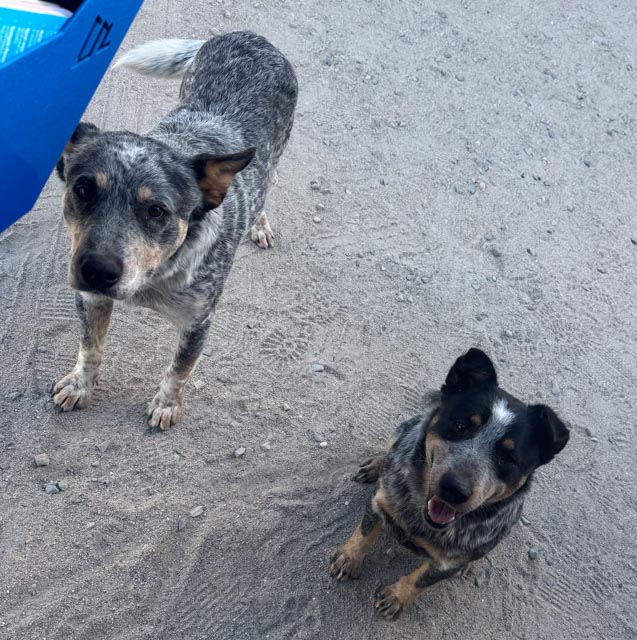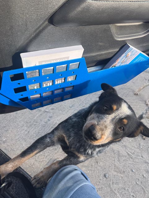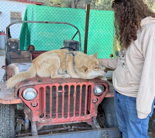 Empezamos a reparar el jeep en el estacionamiento pero Mike’s tiene una fosa que hace todo mas facil. Desafortunadamente, no tuvieron la herramienta que necesité. Per el dia era magnifico, el sol y el cafe al final me calentó, y Dylan mejoró su amistad con los perros.