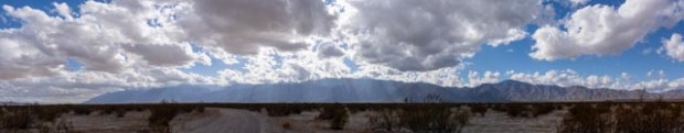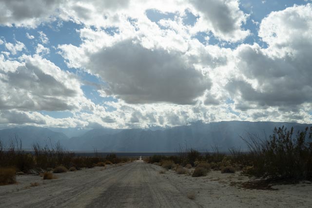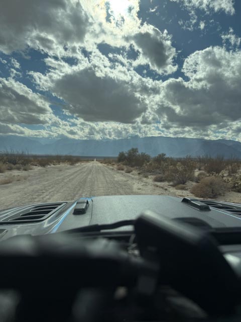 Unas millas mas y dobamos por el camino de tierra y entre el desierto. Las vistas – las montanas, nubles, el sol, cacto, todo increible. El camino estaba muy divertiendo, y era trochas todo alredor . . . paremos para cambiar conductores a Dylan, y pronto probamos una trocha y, como magico, estabamos en la arena plana.