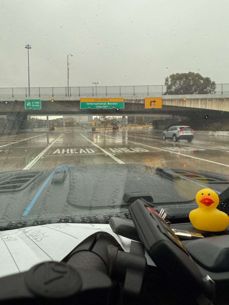 Hoy fue un dia increible. Salimos del hotel a las 8, cargamos auto y empecamos un nuestra viaje. Paremos para gasolina, y seguimos para la frontera. Estaba lloviendo, y hicimos bromas sobre “Sunny San Diego” y “Sunny Mexico.”